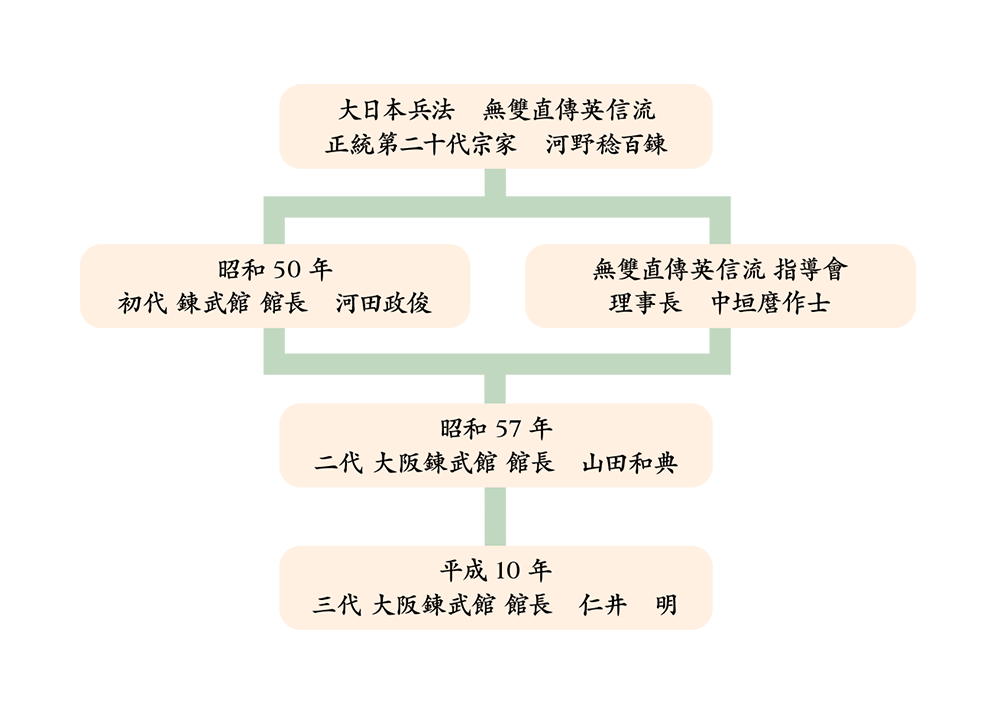 無雙直傳英信流指導會は、故河野稔百錬先生が二十代宗家として結成した組織であったため、二十代宗家の逝去と共に同指導會本部は流派の本部としては機能しなくなったため、同指導會の理事長であった中垣雅司先生以下、同じく大阪で二十代宗家に師事していた二十代宗家直門の者たちが同指導會本部を引き継ぐ形で創ったのが、大阪錬武館です。